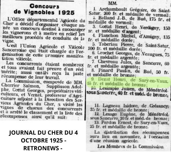 La commission composée de MM Cherrier Salmon, Supplisson Adolphe, Cottat Georges, propriétaires viticulteurs et Vernet, professeur d’Agriculture adjoint à la Direction des Services Agricoles du Cher a visité les vignes de chacun des concurrent et a arrêté le classement et la liste des récompenses ainsi qu’il suit :