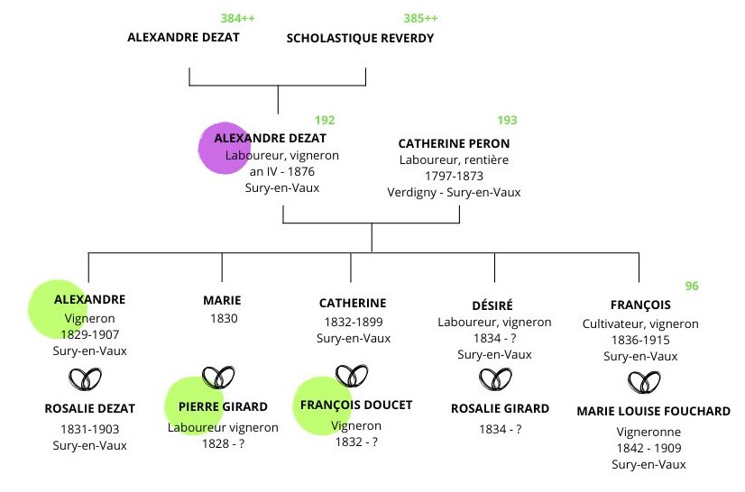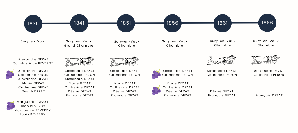 Alexandre DEZAT s’éteint à son tour le jeudi 27 janvier 1876 à 21h00, à l’âge de 79 ans, au hameau de Chambre à Sury-en-Vaux (18300). Sont présents lors de la déclaration de décès son fils Alexandre (47 ans, vigneron à Sury-en-Vaux) et son gendre François DOUCET (43 ans, vigneron à Sury-en-Vaux).