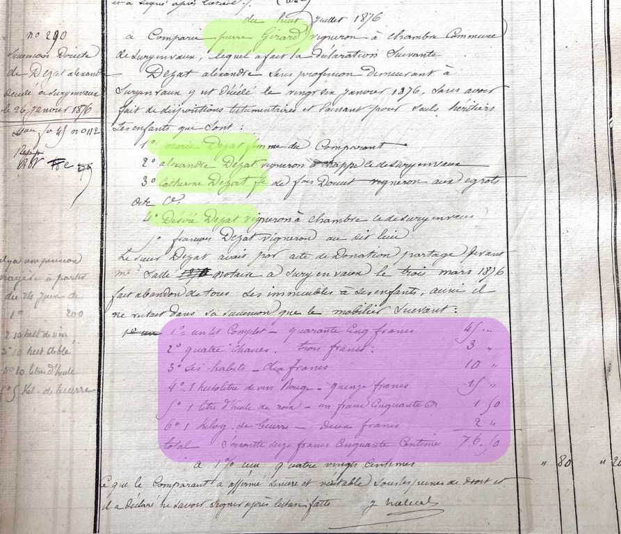 En vert : les déclarants lors du décès et de la succession d’Alexandre Sources (Archives du Cher)