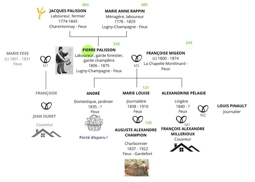 Au recensement de 1872, Pierre PALISSON vit toujours à Feux où il exerce ses fonctions de garde. Sa femme Françoise est également présente, ainsi que leur fille Alexandrine et leur petite-fille Marie Louise CHAMPION, âgée de 9 ans.