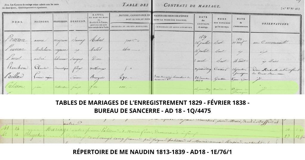 Les préparatifs se poursuivent, et arrive bientôt le jour de rédiger le contrat de mariage. Le 14 janvier 1829, les futurs époux se retrouvent auprès de Me NAUDIN, notaire à Sancergues (à ne pas confondre avec Sancerre, pour ceux qui ne seraient pas du coin). Bien que les possessions des futurs mariés ne semblent pas très élevées, l’acte mentionne une somme de 100 francs, comme l’indiquent la table d’enregistrement des contrats de mariage ainsi que le répertoire du notaire. Il me reste maintenant à chercher l’acte en lui-même.