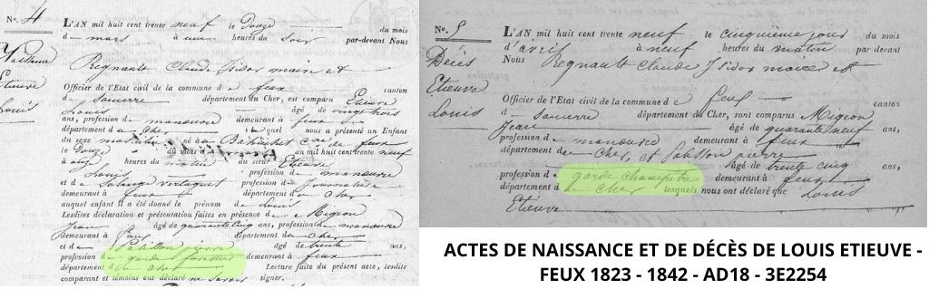 Entre les naissances d’André et Marie Louise se produit un grand changement : de laboureur au domaine de Marnay ou à Savernay, la famille s’installe dans le bourg de Feux où Pierre devient garde champêtre et garde forestier. Les deux fonctions se mélangent dans les actes d’état civil, témoignant du cumul de ces responsabilités.