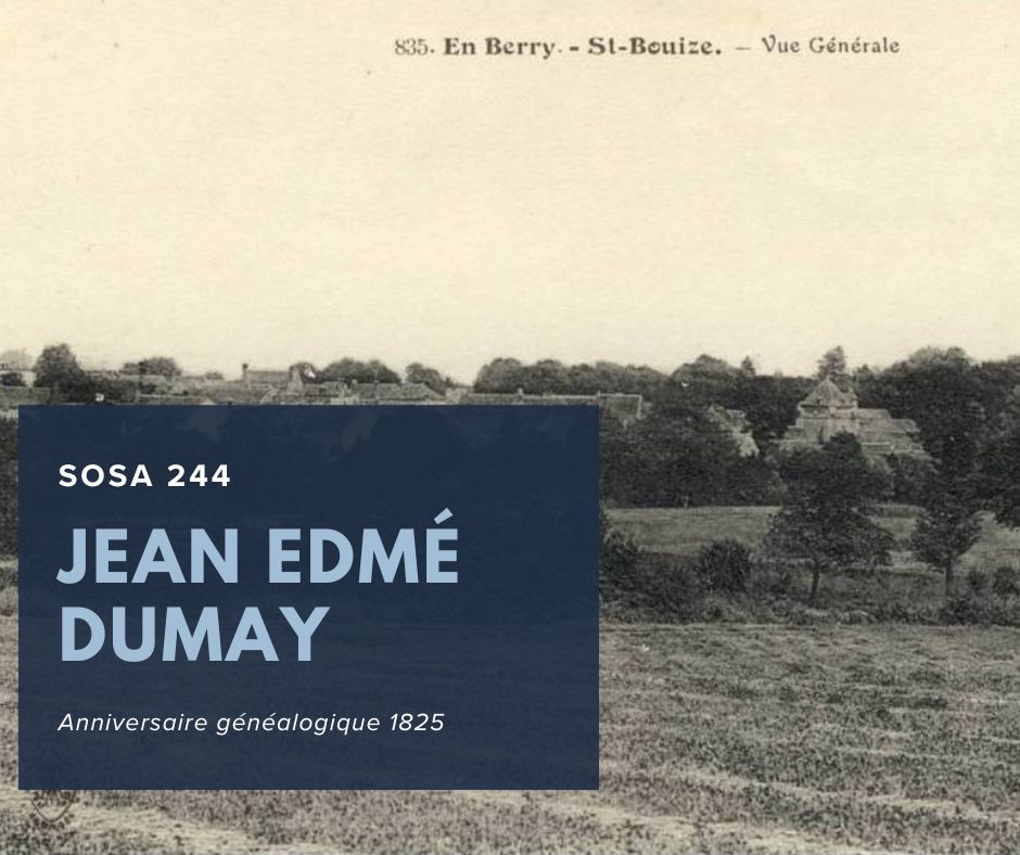 Jean Edmé DUMAY naît le 14 brumaire an XII (5 novembre 1803) à Saint-Bouize, dans le Cher, au hameau de Candie où vécurent plus tard mes arrière-grands-parents. Son père Edmé, âgé de 31 ans, exerce la profession de jardinier. Les deux témoins présents lors de la déclaration de naissance sont un autre jardinier de Candie et un manœuvre du village..